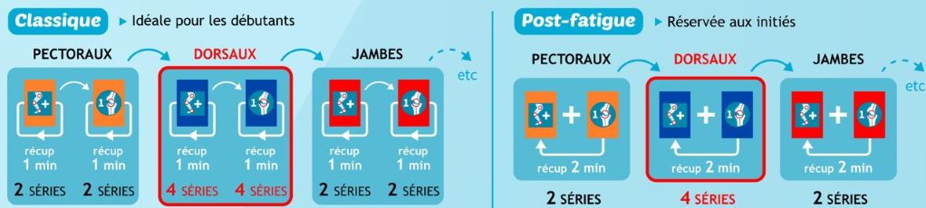 Nous encourageons aussi les pratiquants à planifier au moins une deuxième séance dans la semaine, grâce à laquelle ils pourront appliquer la méthode dusplit : la moitié des groupes musculaire à la séance n°1 (ex : pecs, dos, triceps, épaules), l’autre moitié à la séance n°2 (ex : jambes, biceps, abdos-lombaires) afin de faire davantage de séries et, si possible, inclure le groupe prioritaire à chaque séance.